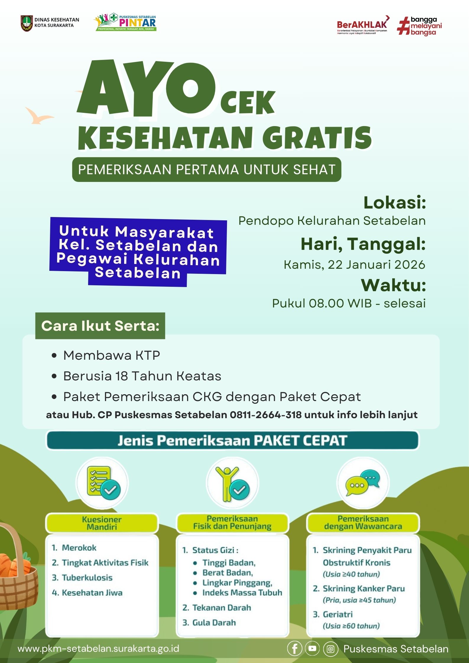 INFO LAYANAN SHARING SESSION ✨Halo #SobatSehat 👋Kabar baik untuk warga Surakarta!Saat ini di Posyandu wilayah Surakarta tersedia layanan sharing session bersama Psikolog 🧠💬Yuk, manfaatkan kesempatan ini untuk berbagi, bertanya, dan mendapatkan insight seputar kesehatan mental 💙Catat dan simak jadwal layanan sharing session di Puskesmas Setabelan ya!Karena kesehatan mental sama pentingnya dengan kesehatan fisik 🌱Jangan ragu untuk datang dan ikut serta ..Salam Sehat,PUSKESMAS SETABELANPINTAR (Profesional, Inovatif, Tanggap, Adil dan Ramah)Rawat Jalan, UGD dan PersalinanFasilitas Kesehatan Tingkat Pertama- Telephone : (0271) 641 033- WhatsApp : 0811-2664-318Info lebih lengkap dapat diakses melalui :https://pkm-setabelan.surakarta.go.id/atau Email : pusk.setabelan@gmail.com-----------------------------------------------------Melayani Dengan Hati Kesehatan Anda Kepuasan Kami